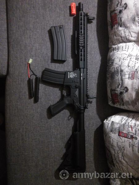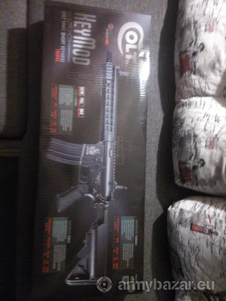 Leírás: Típus: Colt M4A1 Short Keymod Működési elv: Elektromos; (AEG) Lövedék kezdősebessége: 351 fps (1.15 Joule) (0.20 g-os lövedékkel) 2 tárral! Tárkapacitás: 2 x 350 db BB golyó Kaliber: 6 mm BB golyó Anyaga: FÉm (test, előagy, cső, tár), ABS Hop-up: igen, állítható Méretarány: 1:1 Hossz: 680/760 mm Tömege: 2788 g További tartozékok: A fegyver Tisztítópálca 2 x 350-es tár Elsó irányzékállító Hálózati töltó