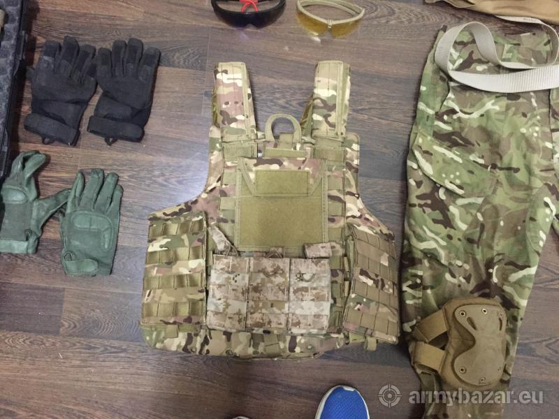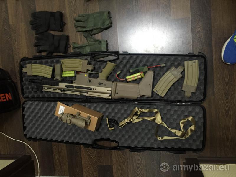 Leírás: Eladó a képen látható komplett airsoft felszerelés. SCRAR L m4 táras automata fegyver tan színű, 401 fps red dot scope 4 db m4 hight cap tár tan színű sisak tan mellény, 3db m4 tárzsebbel+ hátulján 2 rekesz + ivózsák) tan színű hátizsák Fegyvertáska 3 db lippo 4000 db 0,25 bb egy eredeti brit lövész kesztyű 1 replika lövészkesztyű (fekete) Egy brit tan színű nadrág (M-es) 1 db eredeti M-es méretű brit tan felső, kevlar bélések nélkül tan színű rácsos maszk 1 db baklava