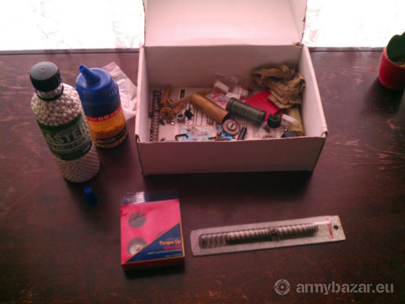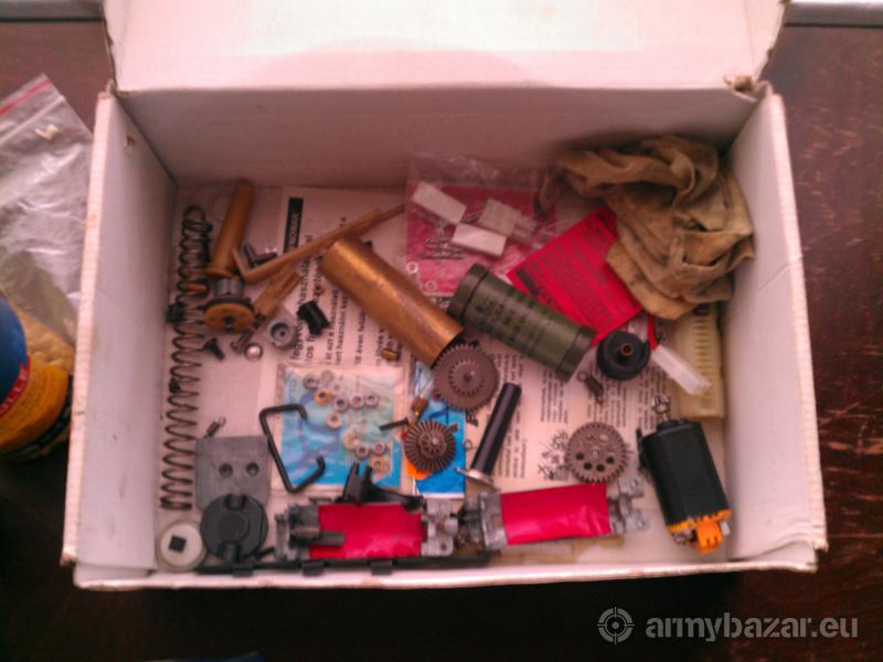 Leírás: Hibái: - A válltámasz sajnos letörött de javítható. - A cső alatt lévő fém rúd kiesik rázkódások során. - Az akkuk elöregedtek és már nem őrzik a töltést, próbára másik aksit tudok hozni. - Az eredeti műanyag tár alját elhagytam, de működik így is. Ami benne van: - CA nagy nyomatékú fogaskerék szett. - 120-as rugó. - Csapágyazott rugóvezető. - Csapágyazott fém dugattyú. - CA gearbox. - CA csapágy szett. Amit tudni érdemes: ez már belülről nem kínai vacak, csak a műanyag külső hagy némi kívánni valót A gearbox, eltérések miatt csak úgy volt beépíthető, hogy a fél automata üzemmód nem működik. Amit még adok: - Tartalék fém tár. - 3500+ 0.25BB - Eredeti kínai alkatrészei.