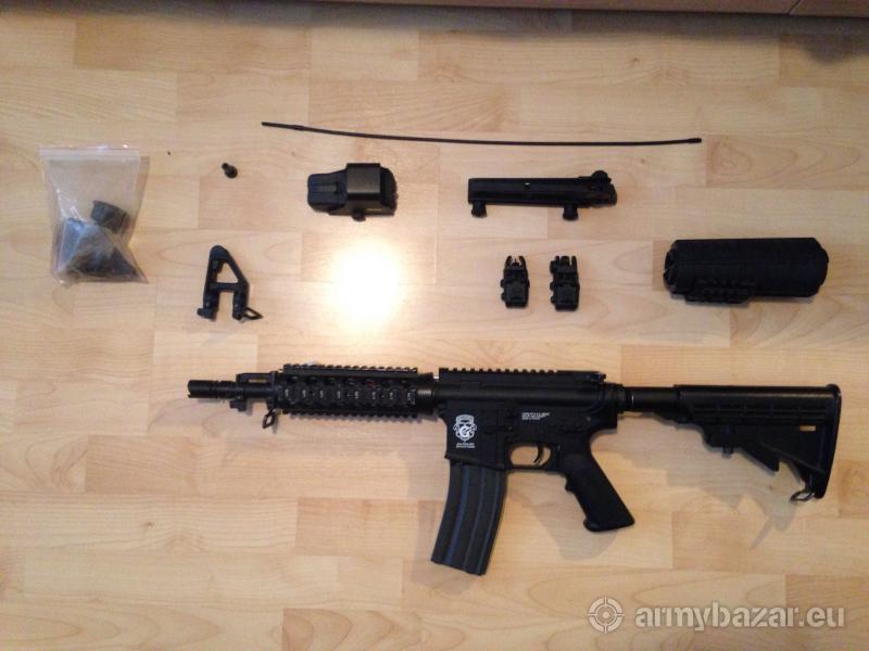 Leírás: Kihasználatlanság miatt eladó lett ez az elektromos (semi/full auto) G&G CQB M4A1 airsoft (GR16 széria). Kitűnően működik szennyeződés mentes. Az előagy és a célzók cserélve lettek, de a gyáriak is járnak hozzá +egyéb alkatrészek, tisztítópálca és célzó állító. Tár az Hi-cap működtetésű (az egyik oldalán le lett ragasztva, mert kicsi mocorgott, de nem befolyásol semmit). Hozzá kapható még egy kitűnő állapotban lévő Holo-Sight-ot. Budapesten megnézhető illetve átvehető, kipróbálni azonban csak Fóton lehet előre egyeztetett időpontban. További adatok: Aksi-1600mAh (gyári) Anyaga-Fém és Abs Tár kapacitás-450 BB FPS-350 (.20g BB-vel) Ajándékba adok még egy koponyás védőmaszkot.