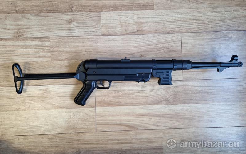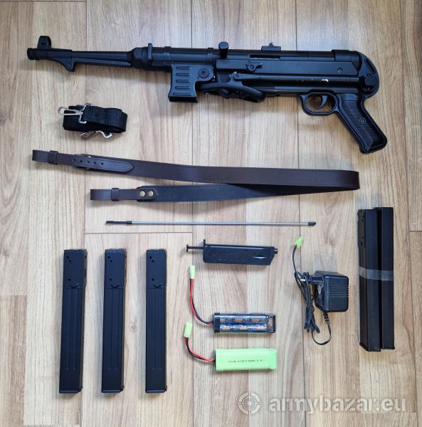 Leírás: AGM által gyártott MP40 airsoft replika (MP007B), ami full fém! Mechanikailag teljesen jól működik, bár eddig csak 2 játékon használtam. Kis festék kopások találhatóak rajta, ezeket a képeken láthatóak. Amit a hirdetésem tartalmaz: - MP40 airsoft replika - 3db jól működő tár ami darabonként 30-40 BB-t képes befogadni. - 2db hibás tár (de lehet hogy lehet még javítani) - 1db gyorstöltő - 1db cső tisztító pálca - 1db NIMH töltő - 1db NiMH akkumulátor 8.4V 1100mAh - 1db NiMH akkumulátor 8.4V 1600mAh (külön vásárolt) - 1db hozzá járt fegyverszíj - 1db külön vásárolt bőr fegyverszíj Adatok: Kezdő sebesség: 100 m/s (328 FPS) Hossz: 626 / 845 mm Tömeg: ~2770g